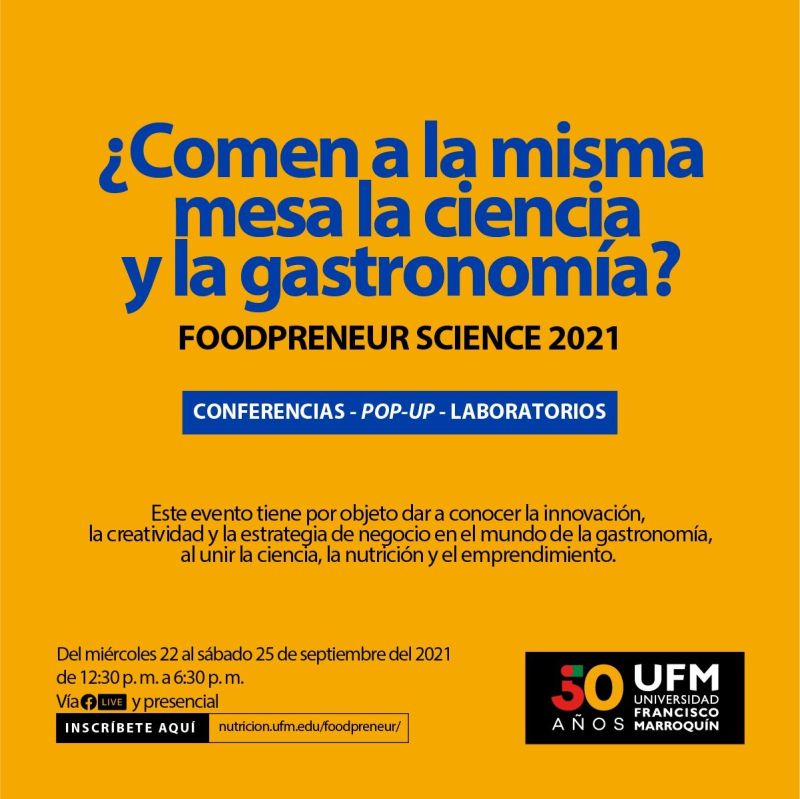 ¿Comen a la misma mesa la ciencia y la gastronomía? Es la pregunta a la que respondo en mi participación en Foodpreneur Science 2021, evento online organizado por la Universidad Francisco Marroquin (Guatemala) con el objetivo de dar a conocer la innovación, la creatividad y la estrategia de negocio en gastronomía, a través de la unión de ciencia, nutrición y emprendimiento.